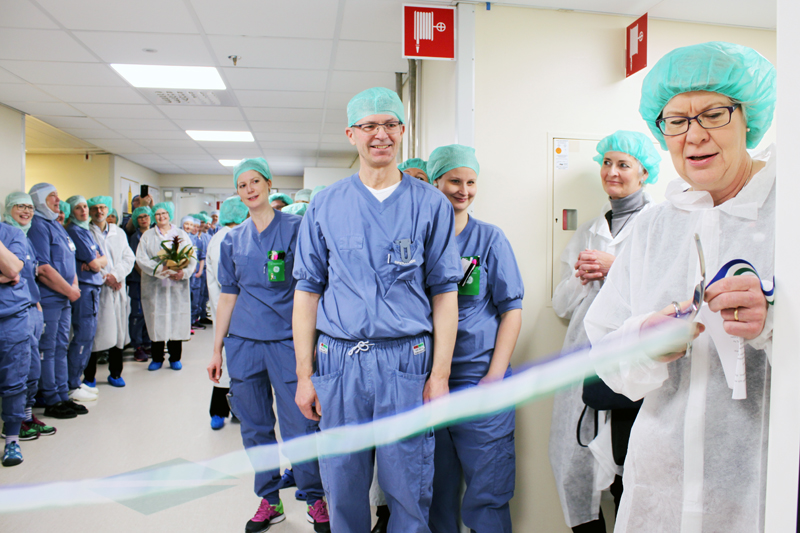 Förstora bildenAnn-Marie Johansson (S), ordförande i regionstyrelsen, klipper bandet och deklarerar den nya operationssalen officiellt invigd. Foto: Sara Rönnberg